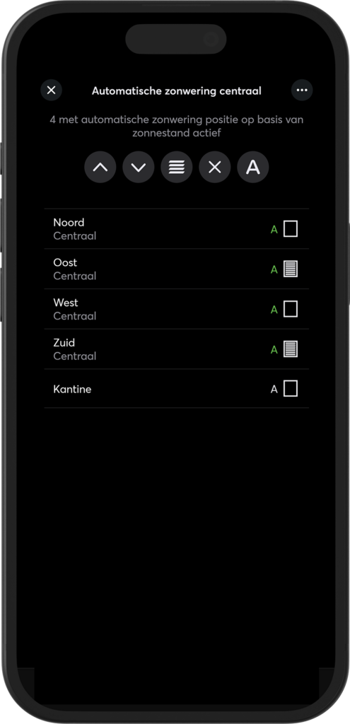 Verlichting, zonwering en klimaatregeling passen zich automatisch aan op basis van weersvoorspelling, zonnestand, lichtniveau en aanwezigheid. Zo bespaar je energie en verbeter je het comfort zonder handmatige bediening.